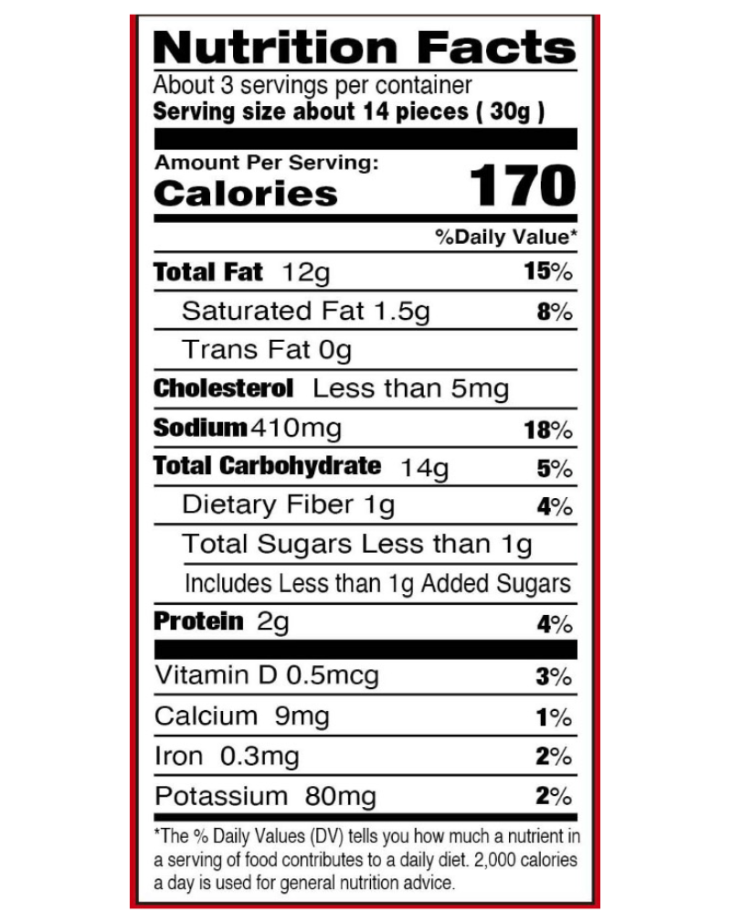 - 栄養成分表示(100gあたり)エネルギー 559kcal たんぱく質 6.3g 脂質 37.8g 炭水化物 50.5g 食塩相当量 2.3g(推定値)